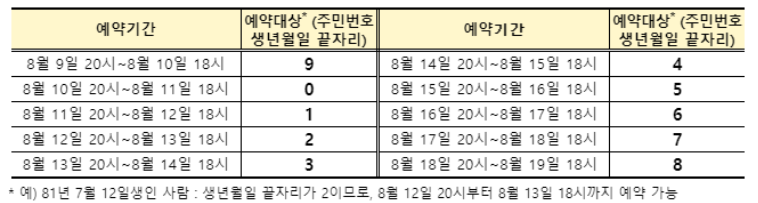 ○ 8월 9일(월) 20시부터 8월 19일(목) 18시까지는 10부제를 통한 사전예약이 진행되며, 날짜별 예약 가능한 대상은 주민등록번호 생년월일 끝자리를 기준으로 정해진다.