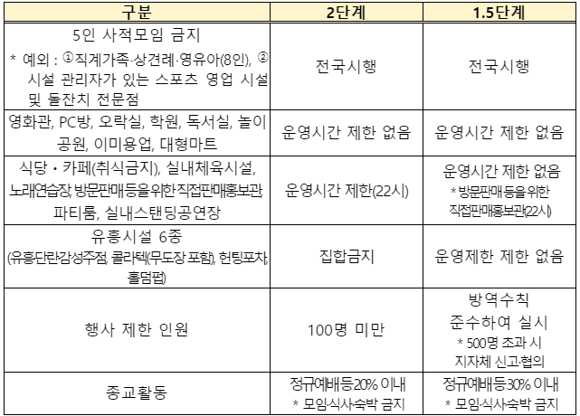 * 노래연습장, 실내체육시설, 목욕장업, 음식점‧카페(22시 이후 포장‧배달만 가능), 파티룸, 실내스탠딩공연장, 방문판매 등을 위한 직접판매홍보관(수도권 약 43만 개소, 비수도권 약 52만 개소 중 2단계 지역 업소만 해당)
