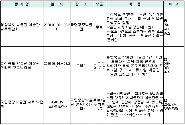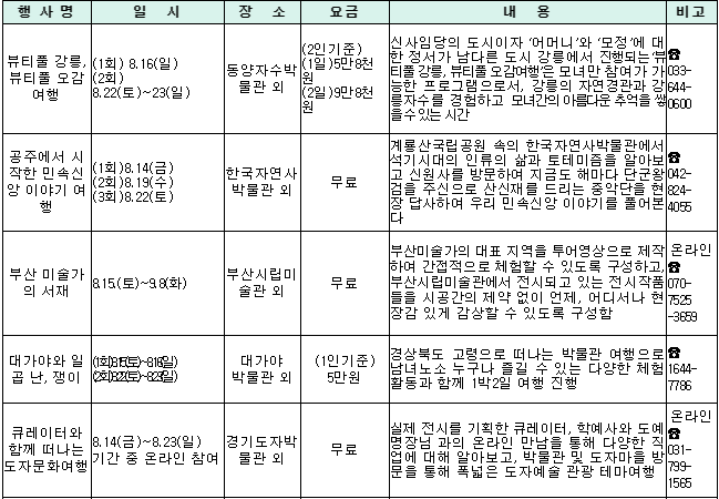 - 8. 14.~23. 전국 박물관·미술관에서 교육, 여행, 체험 프로그램 등 운영