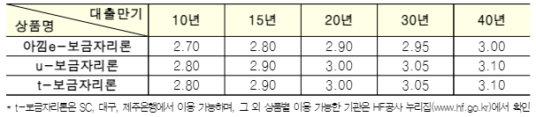 이에 따라 9월 1일 신청완료건을 기준으로 대출만기별로 ‘u-보금자리론‘과 ‘t-보금자리론‘은 연 2.80%(10년)부터 3.10%(40년), ‘아낌e-보금자리론‘은 이보다 0.1%포인트 낮은 연 2.70%(10년)부터 3.00%(40년)가 기준금리로 만기까지 고정 적용도비니다.