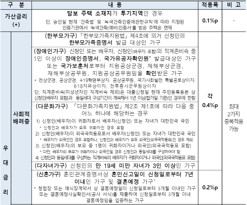 ※ 한부모‧장애인‧다문화‧다자녀‧신혼가구 우대금리는 ①주택가격 6억원 이하 ②부부합산 연소득 6천만원 이하 (단, 신혼가구 및 다자녀가구는 7천만원 이하) ③주택면적 85m2(「국토의 계획 및 이용에 관한 법률」에 따른 수도권을 제외한 도시지역이 아닌 읍 또는 면 지역은 100m2) 이하(단, 다자녀가구는 제외)인 경우 적용 가능