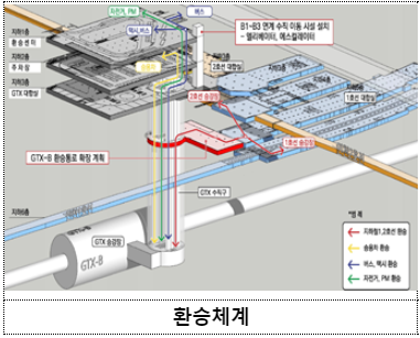 ㅇ 지하1층에 버스환승센터를 계획해 GTX로의 수직동선을 최적화했고, 지하2층에는 대규모 환승주차장과 GTX 대합실을 구상함으로써 환승편의를 극대화했다.