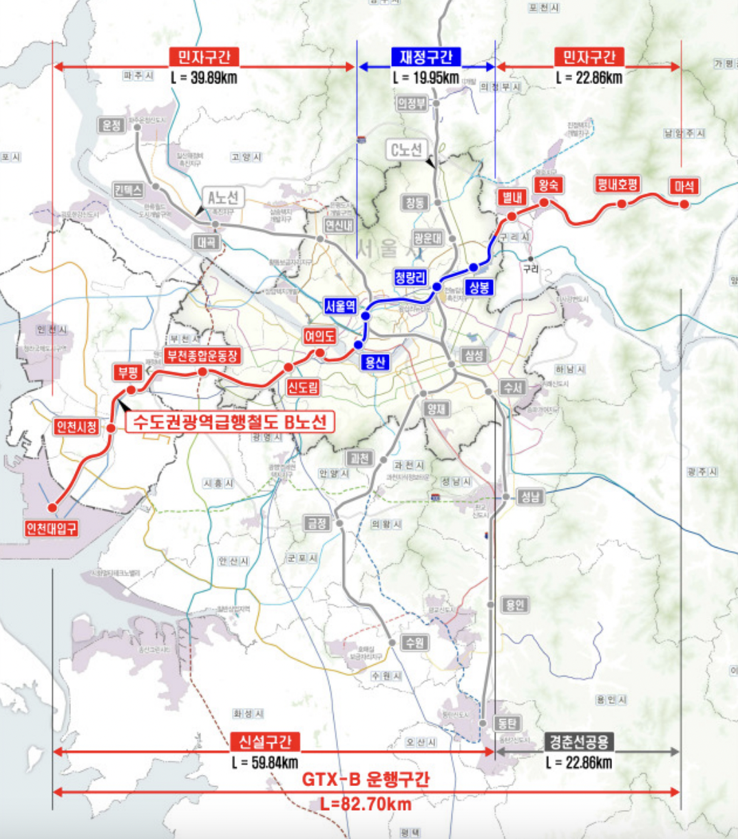 - 참고로 민자구간은 인천대입구 ~ 용산, 상봉 ~ 마석 62.8km이고 재정구간은 용산 ~ 상봉 19.9km입니다.