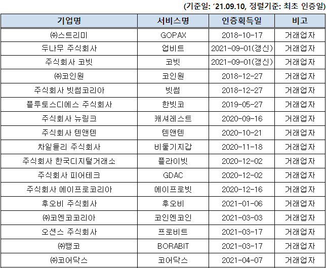□ 불필요한 혼란 방지와 이용자 보호 차원에서 정보보호관리체계(ISMS) 인증획득 가상자산사업자(40개, 9.10일 기준) 명단을 공개 합니다.