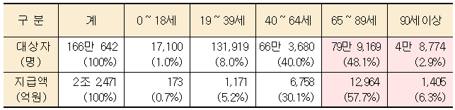 연령별로는 65세 이상이 847,943, 14,369억 원으로 전체 대상자의 51.0%, 지급액의 64.0%로 높은 비중을 차지하였다.
